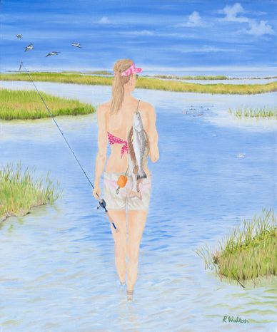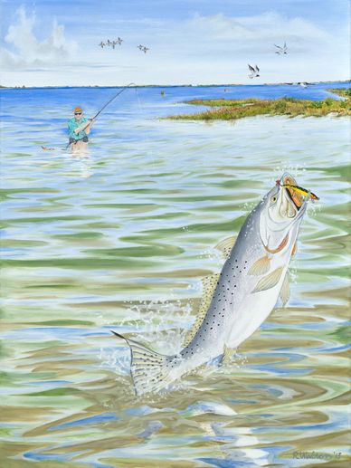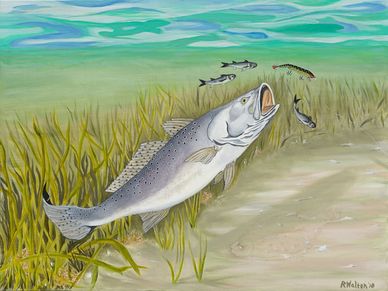 A big sow trout rising to hit an EDS lure intermingled with a following group of finger mullet. My son insisted that I put a flounder on the bottom. One of my earliest works and a great seller.
