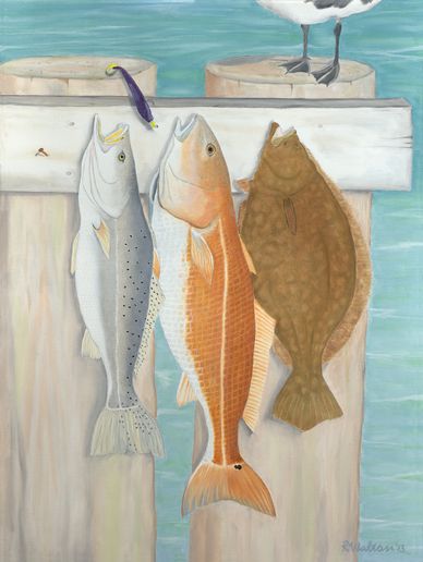 A whimsical depiction of the Texas Inshore Slam: a speckled trout, a redfish, and a flounder. The seagull is eyeing the "Matagorda" purple and chartreuse plastic lure. One of my best sellers!