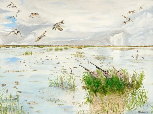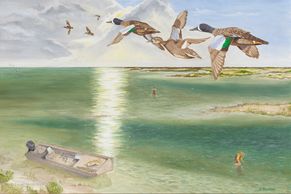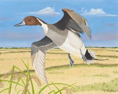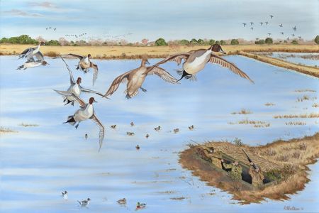 My buddies and I had a duck lease for 11 years. We could always depend on a limit of pintails when we were hunting the pit blind. I even got my old chocolate lab, Molly, in the painting.